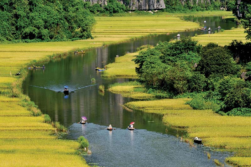 01:30 PM: Continue the tour with a visit to Trang An – a famous scenic complex recognized as a UNESCO World Heritage site. Here, you will embark on a boat trip along winding rivers flowing through spectacular caves and magnificent limestone mountains. This is not just a sightseeing trip but also an opportunity to experience the harmony between nature and humans, explore diverse ecosystems, and learn about the historical stories connected to this land.